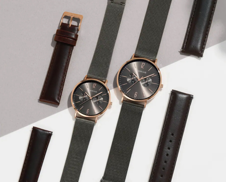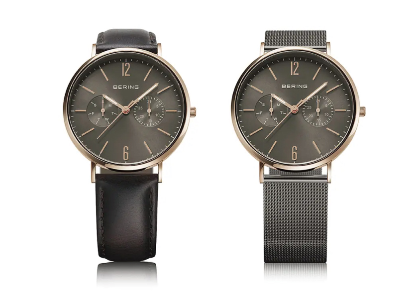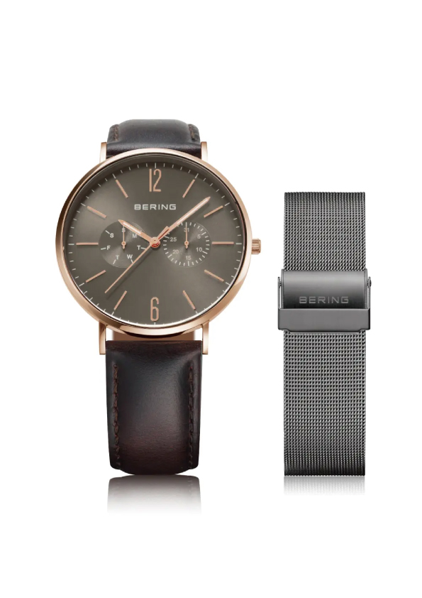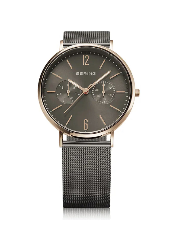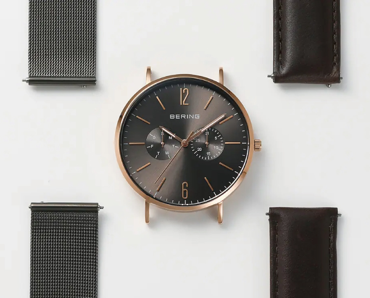 グレーカラーにローズゴールドで高級感とレトロな雰囲気がコーディネートを大人っぽいイメージに仕上げてくれます。替えベルトでさらにシックな感じにもできます。