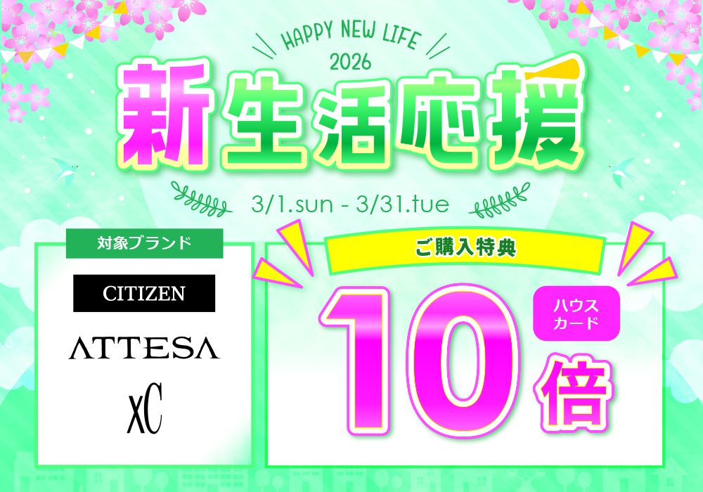 CITIZENの人気ブランド、メンズ【ATTESA】、レディース【XC】を対象にご購入特典として『 ハウスカード10倍 』進呈いたします!!